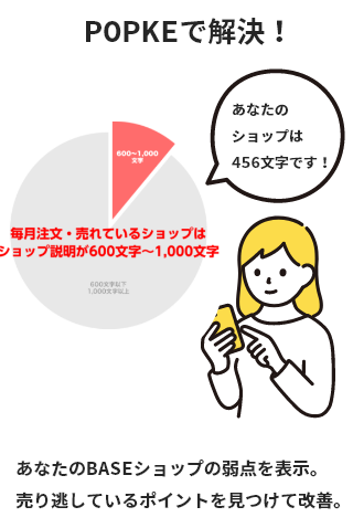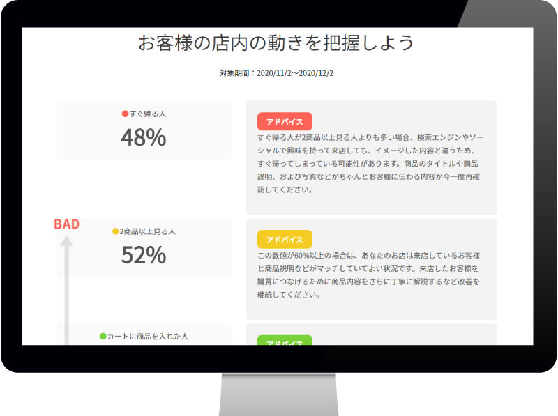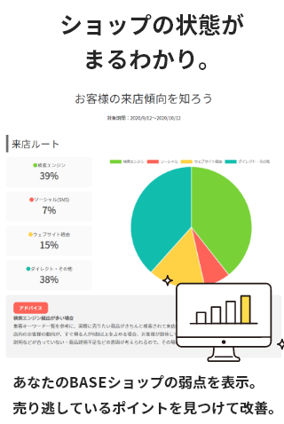 あなたのBASEのお店の改善アドバイスを分析して、できることをお伝えします。お客様がどのようなワードやルートで来客しているか、ショップ内ではどこで躓いているかなどの傾向を知ることができます。